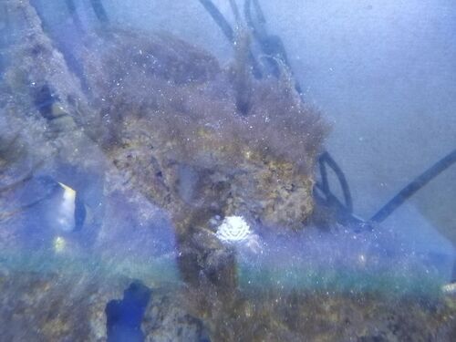 夜に60センチ水槽を覗いてみると見たことがないのがライブロックにいました。 なるほど、タカラガイのトランスフォー厶した姿か! その下にはエメラルドグリーンクラブも苔を食べてくれてました。 頑張ってー