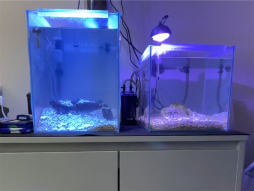 こんな感じでジョーフィッシュ水槽を2つ並べてましたが、右側の水槽がライトのせいか?緑苔の大量発生が全く止まりません。 それに緑苔のせいかわかりませんが、水の臭いがすごく、スイカみたいな臭いがしてました。 水換えても改善しないしこりゃダメだとい…